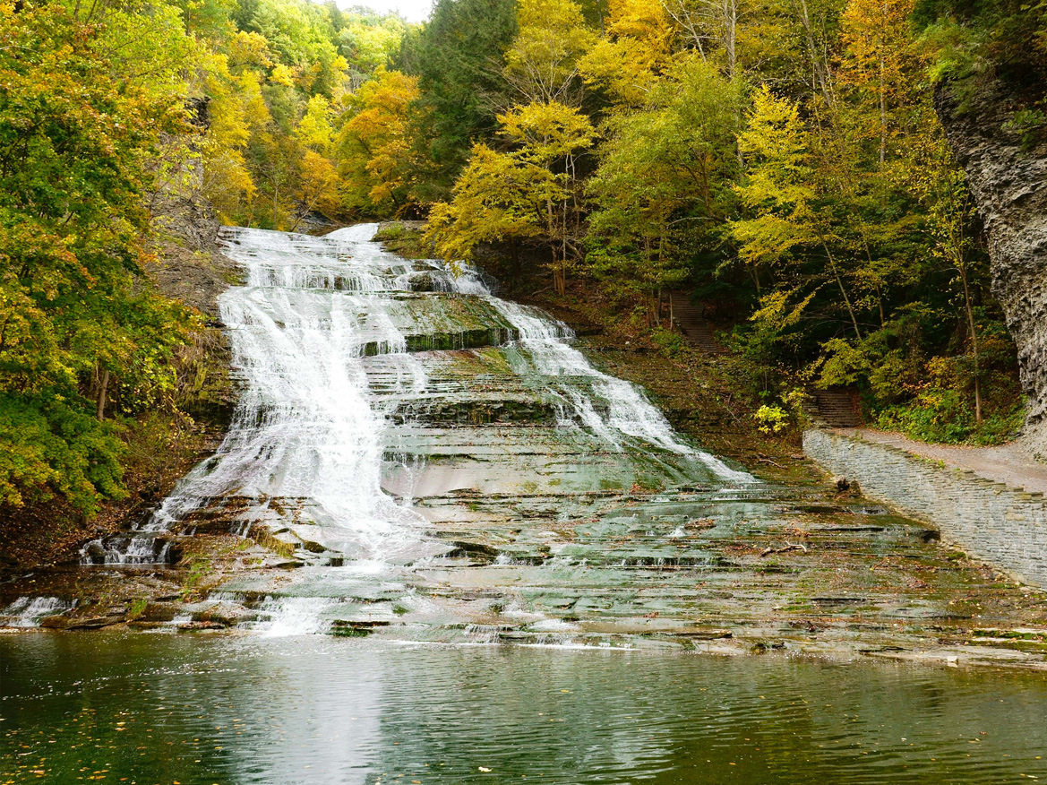 Located just on the southern edge of Ithaca, Buttermilk Falls is a popular spot for tourists and local residents, especially during the height of summer. At the entrance is the park’s namesake: a foaming and frothy waterfall with a deep pool and dammed swimming area below. Hikers who ascend the handsome stonework stairs and past the waterfall are treated to an endless supply of stunning waterscapes. And the trail system extends beyond the gorge and rim trails to the upper section of the park, which includes a loop trail around Lake Treman, where ambitious visitors can pick up the orange-blazed Finger Lakes Trail.