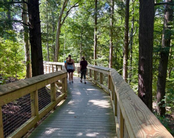 In 2008, the Land Trust conveyed 36 acres to New York State, creating the Carpenter Falls Unique Area. The remaining 51 acres of land downstream toward the lake continue to be owned and managed as the Land Trust’s Bahar Nature Preserve. The Land Trust has entered into a cooperative management agreement with the state, engaging volunteers to help take care of this special place. In 2022, the state completed access improvements at Carpenter Falls including an elevated boardwalk leading 630 feet from the parking lot to an observation platform, accessible to people with mobility impairments.