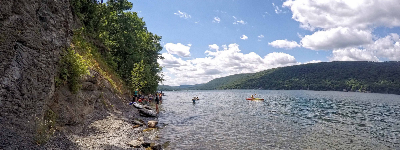 A paddle along Skaneateles Lake’s eastern shore will wow paddlers young and old. Leave from the boat launch at the Town of Scott Family Park, located just off of Glen Haven Road. From there, a two-mile paddle along the lake’s edge will bring you to the Finger Lakes Land Trust’s Cora Kampfe Dickinson Conservation Area which protects 1,300 feet along the bluffs known locally as the “Staghorn Cliffs.”